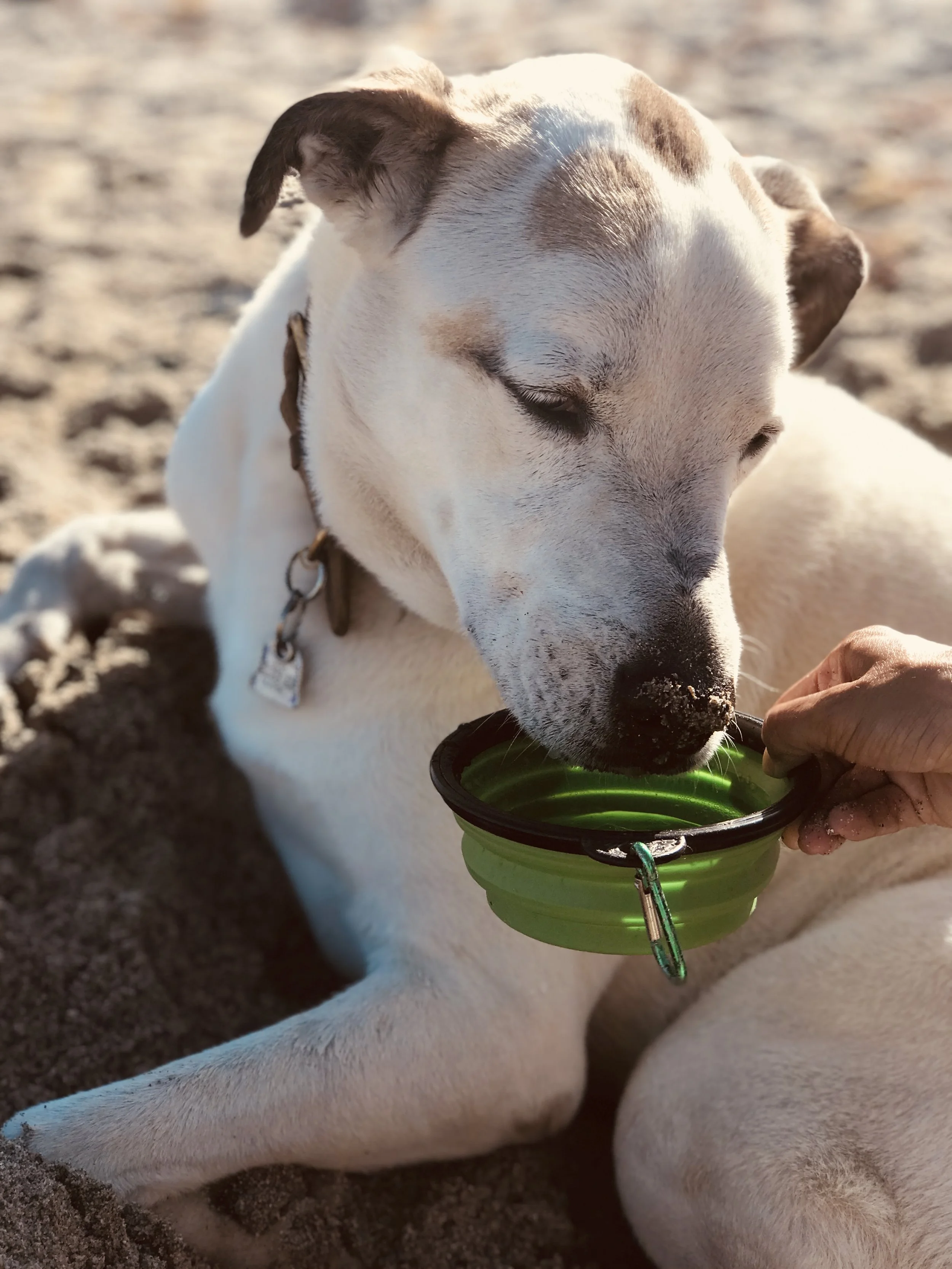 Coming to the beach with our pets requires a little bit of extra responsibility and attention -same as with our kids. Fresh drinking water and a container is essential to keep hydrating our canine, there are a few portable containers on the market that are pretty good for this type of practice. See picture 2 & 3.